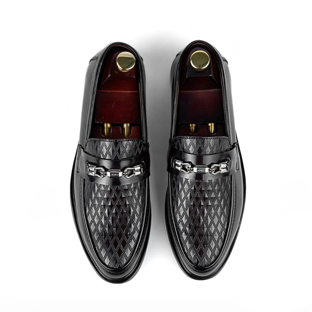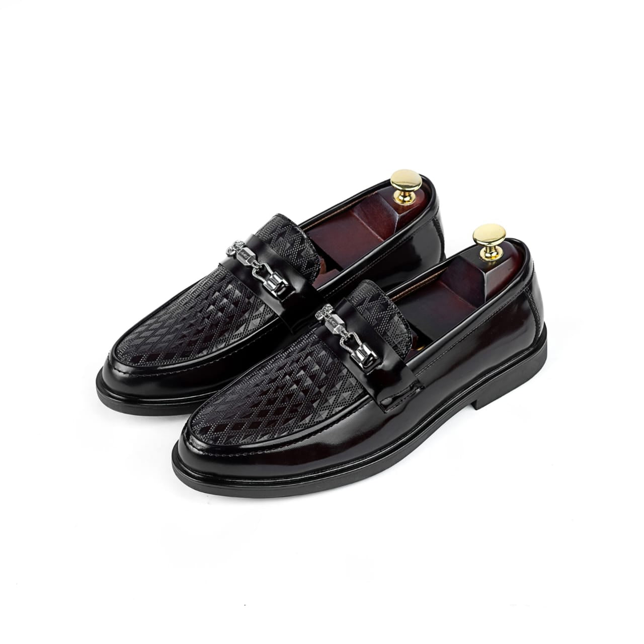 حذاء لوفر رجالي فخم مصنوع من جلد مستورد لماع عالي الجودة، يتميز بتصميم عصري يجمع بين النقشة الشبكية الأنيقة على الجزء الأمامي والحلية المعدنية اللامعة التي تضيف لمسة فخامة. مريح وخفيف، مثالي للإطلالات الرسمية والاجتماعات والمناسبات الخاصة. متوفر بألوان: أسود – بني – هافان