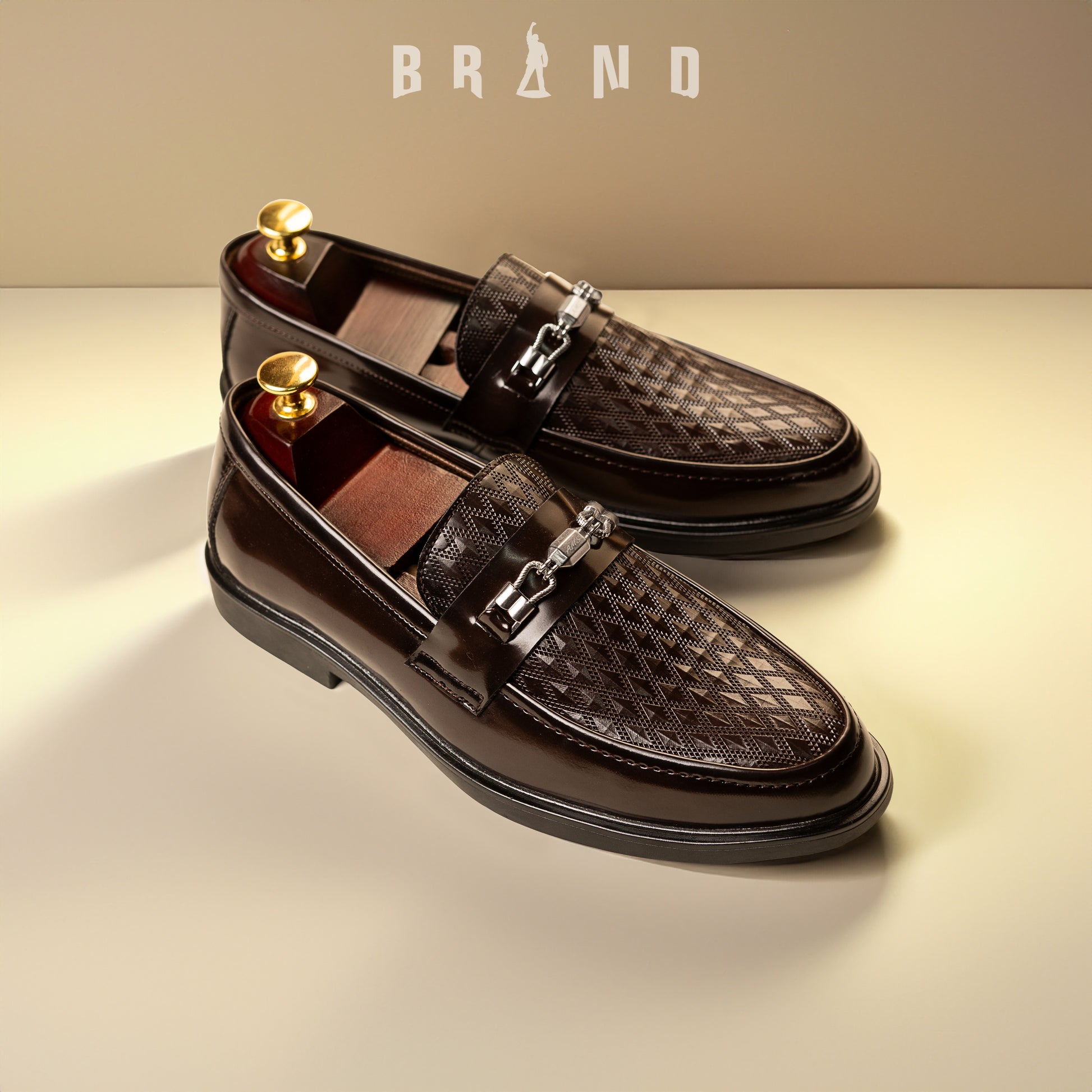 حذاء لوفر رجالي فخم مصنوع من جلد مستورد لماع عالي الجودة، يتميز بتصميم عصري يجمع بين النقشة الشبكية الأنيقة على الجزء الأمامي والحلية المعدنية اللامعة التي تضيف لمسة فخامة. مريح وخفيف، مثالي للإطلالات الرسمية والاجتماعات والمناسبات الخاصة. متوفر بألوان: أسود – بني – هافان